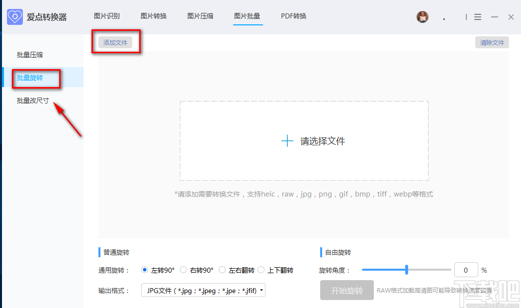2.在图片批量处理页面中,我们在页面左上方找到“批量旋转”选项,点击该选项界面右侧就会出现相应的操作选择;接着小编在页面左上方找到“添加文件”按钮并点击,进入到文件添加页面。