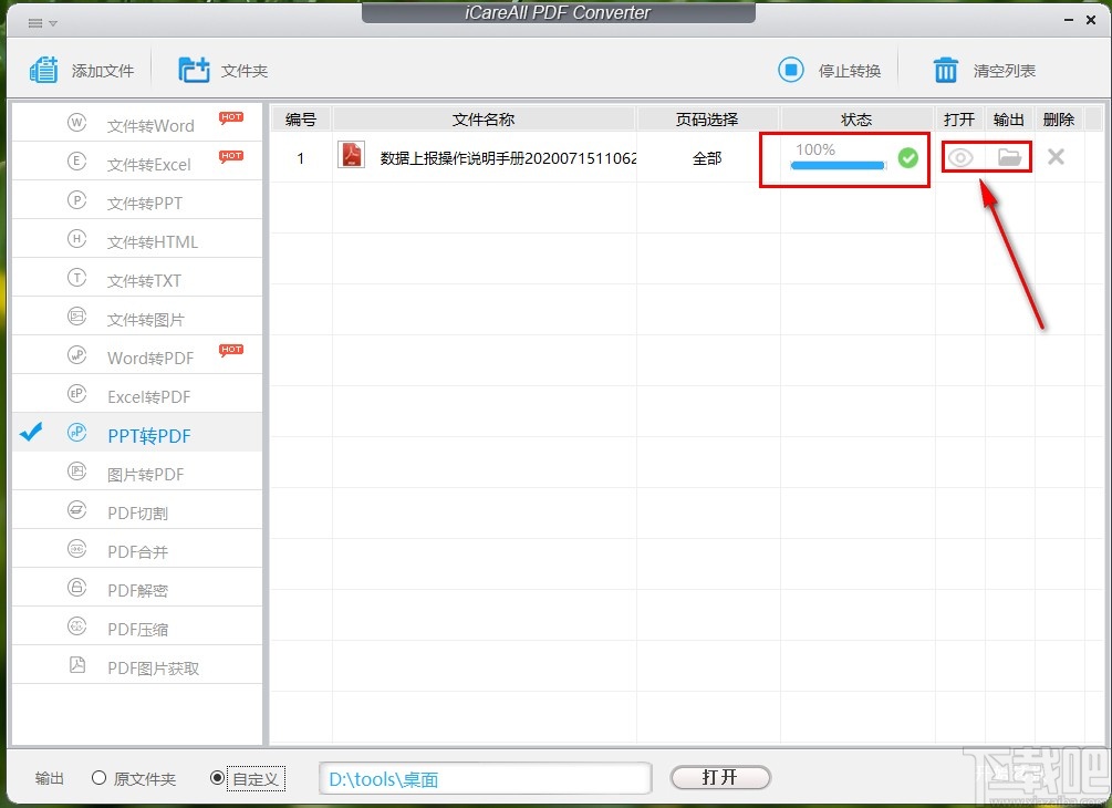 6.等待一会转换操作完成之后,我们在界面可以看到转换操作的状态为100%,点击打开选项的图标可以直接打开文件,点击输出选项的图标可以打开输出文件夹。