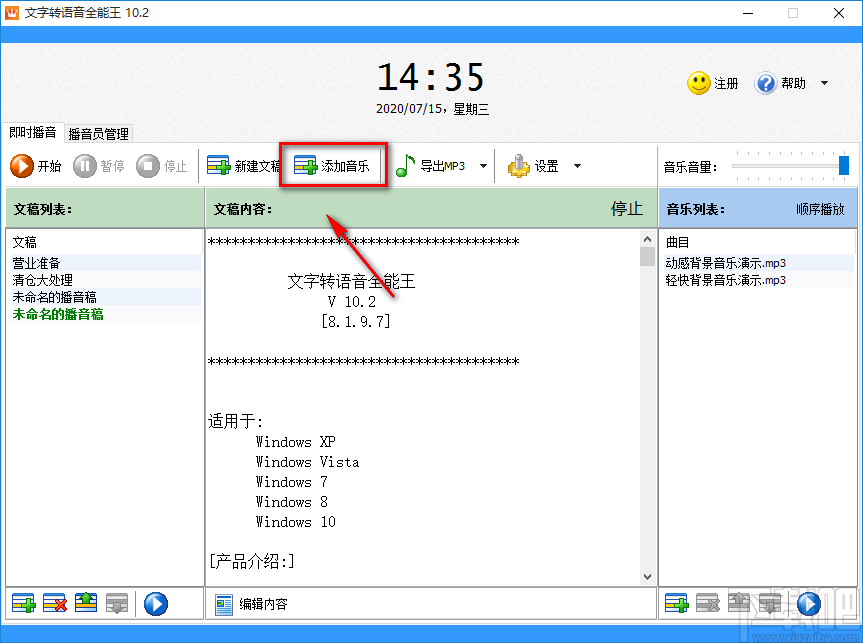 8.接下来在界面上方可以找到“添加音乐”按钮,如果想要给转换后的语音文件添加背景音乐,则点击该按钮进入到音乐文件添加页面将背景音乐导入到软件中。