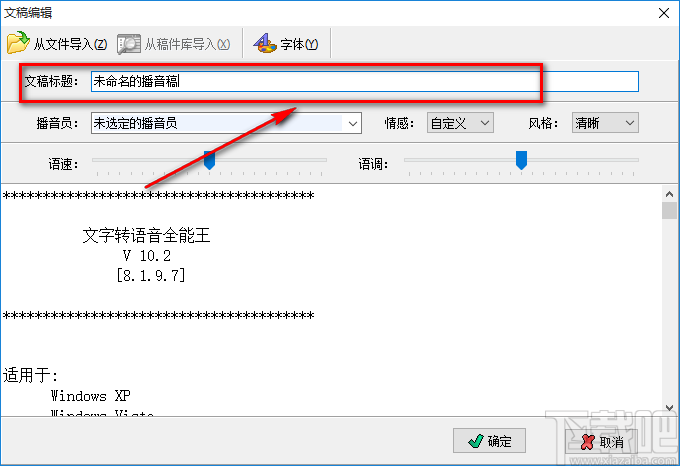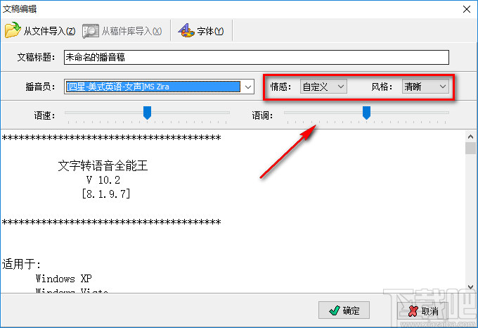 7.然后在页面上找到“语速”、“语调”两个选项,我们可以拖动两个选项后面的光标对这两个参数进行调整;之后再点击页面右下角的“确定”按钮即可回到软件界面上。