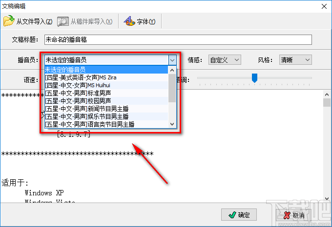 5.紧接着在页面上方找到“播音员”选项,我们点击该选项后面的下拉框,并根据需要在下拉框中对播音员进行选择。