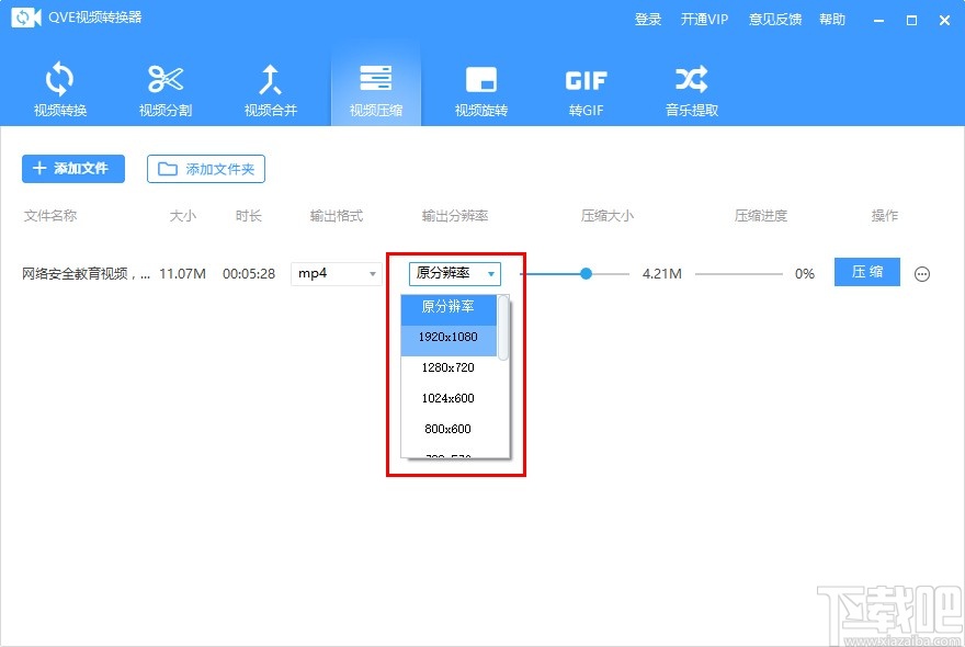 5.选择好压缩分辨率之后,我们点击后面操作选项的压缩按钮就可以进行压缩操作了,点击压缩之后等待压缩操作完成即可。