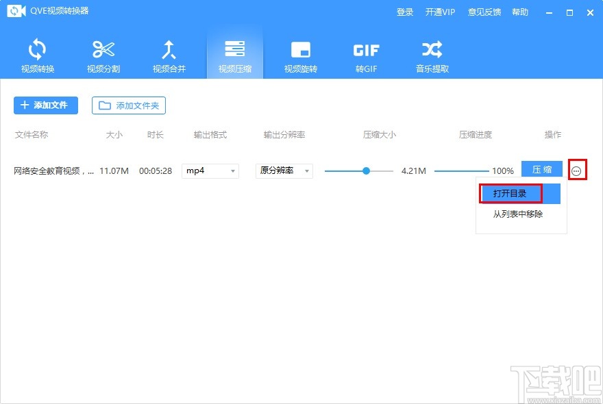 6.最后等到压缩操作完成之后,在操作下方点击三点按钮,然后在出现的选项中点击打开目录这个选项即可打开压缩输出的视频文件所在的目录查看文件。