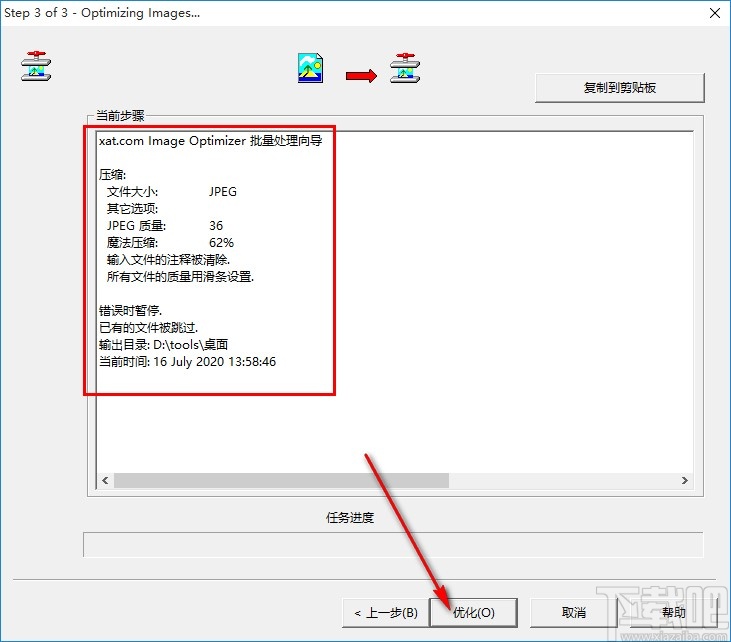 7.最后会来到查看压缩信息的界面,我们在界面中可以看到图像的压缩大小、压缩率等相关设置参数,确认无误之后点击下方的优化按钮即可开始压缩图像。