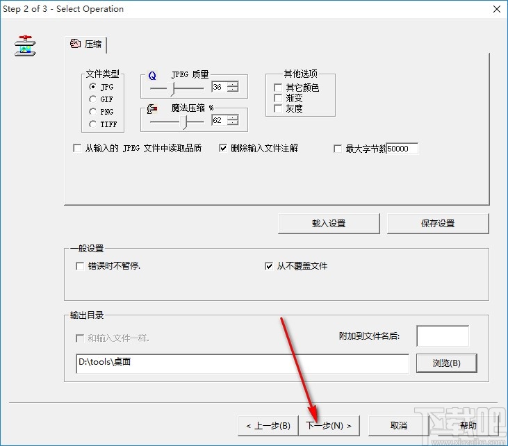 3.点击这个下一步按钮之后,在出现的压缩设置界面,我们可以点击JPEG质量选项和魔法压缩选项的调整图标,左右滑动可以调整质量和压缩比。