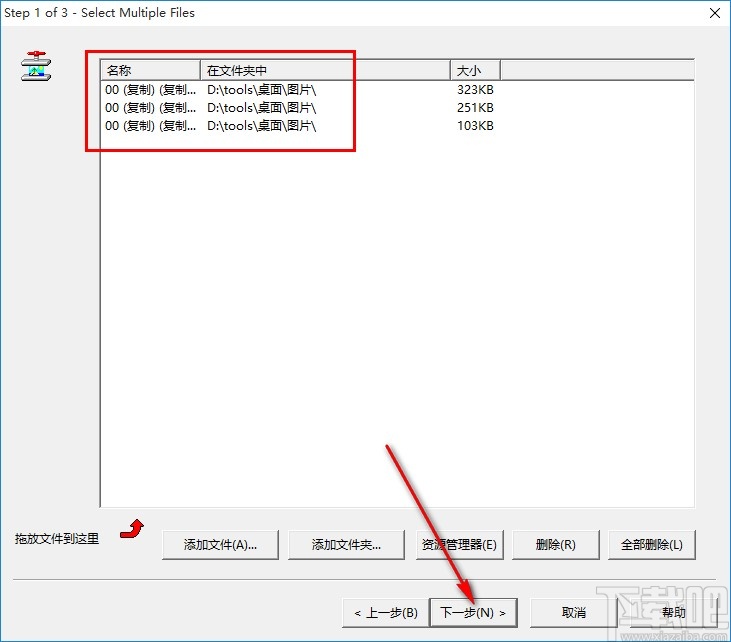 2.点击打开按钮将图像添加到软件界面之后,我们在界面中可以看到文件添加进来的列表,接着需要点击下方的下一步按钮。