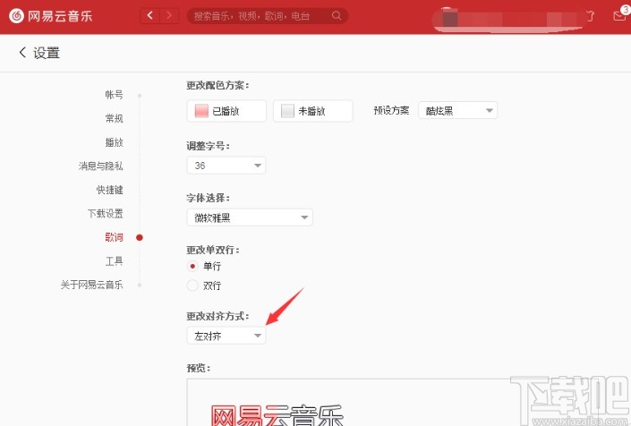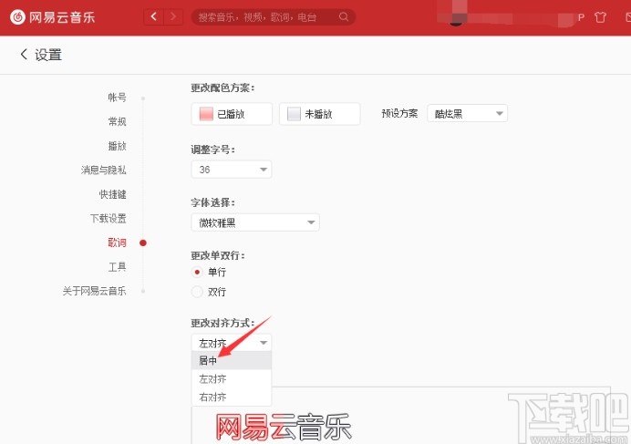 3.切换到这个歌词设置界面之后我们可以看到有一个更改对齐方式的选项,我们点击下拉列表可以设置对齐方式。