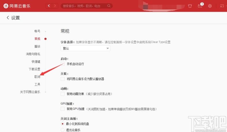 2.进入到设置界面之后,我们在界面的左边列表中,找到歌词这个选项,点击之后切换到歌词设置界面。
