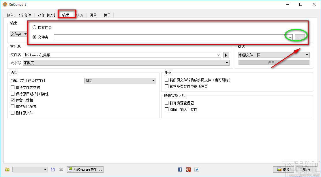 3.将图片文件添加到软件后,我们在界面顶部找到“输出”选项,接着在界面上找到输出一栏,我们根据自己的需要在该栏里对输出文件夹进行选择,小编选择“文件夹”,所以还要点击该选项后面的三个小点按钮进入文件保存路径选择页面。