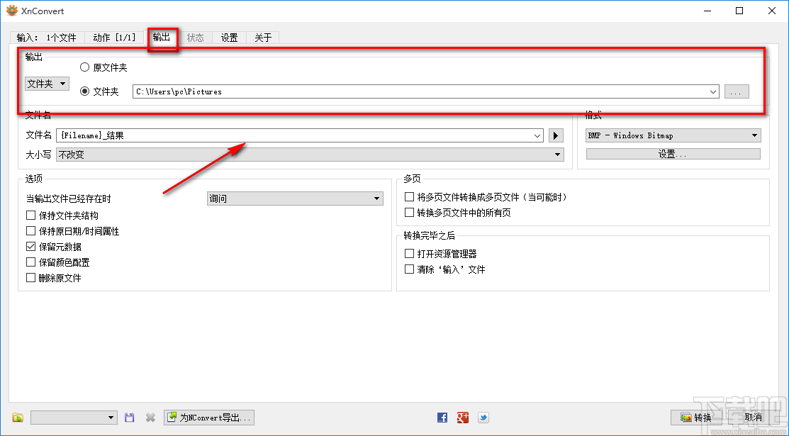 11.最后在页面上方找到“输出”选项并点击,其下方会出现相应的操作选择,我们根据自己的需要在页面的左上方对输出文件夹进行设置,小编在这里选择“原文件夹”;如果选择“文件夹”,则还要点击其后面的三个小点按钮进入文件保存路径选择页面对输出目录进行设置。
