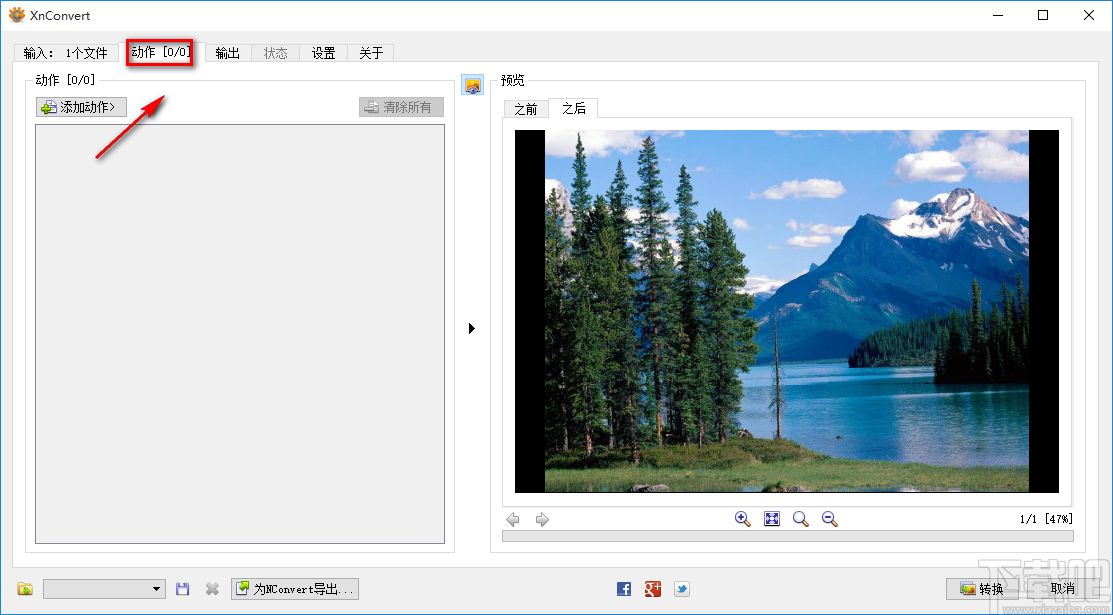 3.将文件添加到软件后,我们在界面顶部找到“动作”按钮并点击,进入到动作页面。