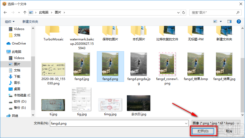 6.在水印图片添加页面中,我们找到水印图片后,再点击页面右下角的“打开”按钮即可将文件添加到软件中。