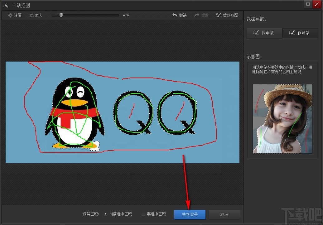4.选择好抠图方式进入到抠图界面之后,我们用红色的删除笔选中图片中不需要的部分,然后用绿色的选中笔选中想要留下来的抠图部分,最后点击下方的替换背景按钮。