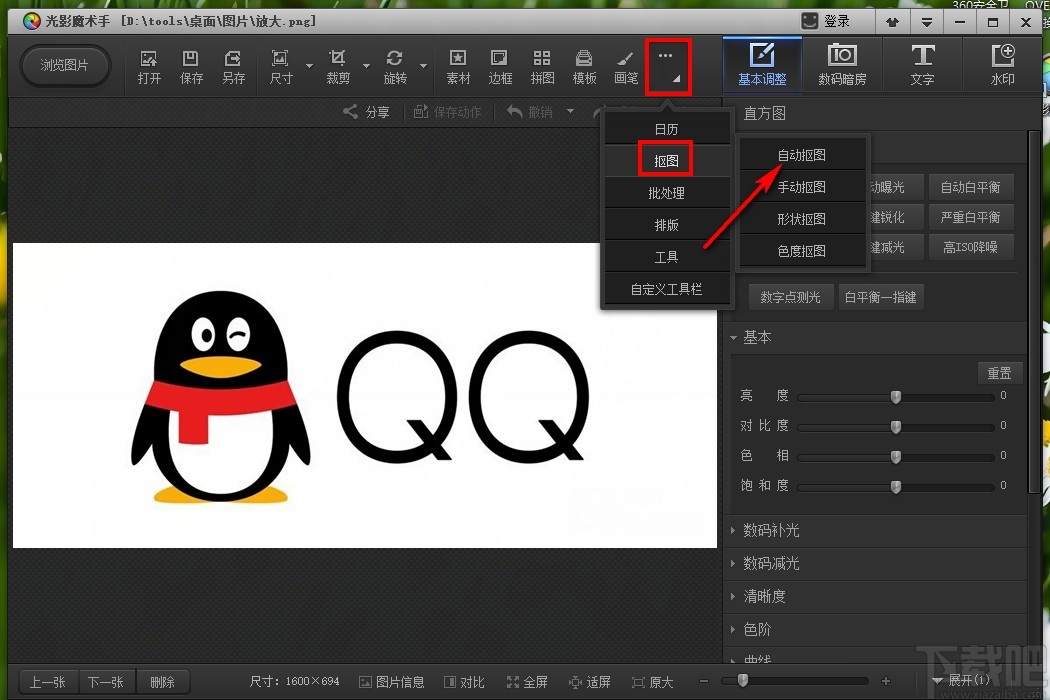 3.点击编辑图片之后成功将图片添加到编辑功能界面,然后我们点击上方操作图标最右边的三点按钮,在出现的选项中选择抠图,然后选择抠图方式,小编选择自动抠图。