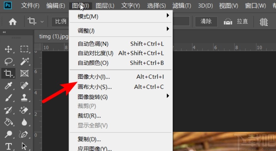 2.之后下一步我们在界面上方找到图像这个选项,点击之后在打开的菜单选项中找到图像大小选项点击进去。