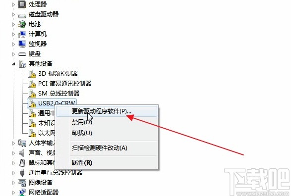 6.进入到设备管理器界面之后,我们找到其他设备选项点击打开,可以看到所有的驱动设备都会显示一个感叹号,之后我们找到其中一个右键点击,然后选择“更新驱动程序软件”这个选项。