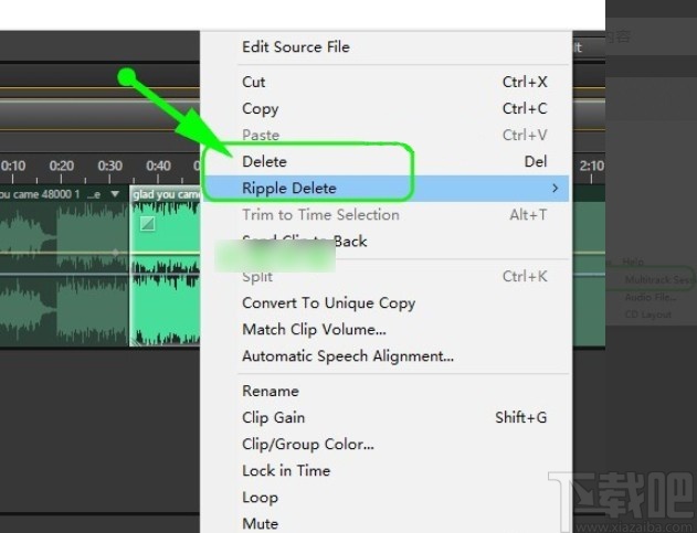 7.紧接着我们可以用鼠标选中想要删除掉的音频片段,右键点击之后选择delete按钮可以将这个片段删除掉。