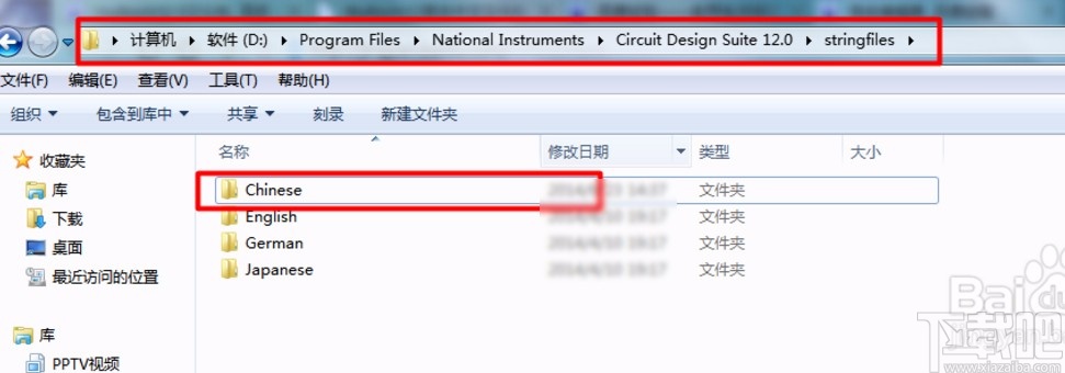 3.下一步我们需要将这个Chinese文件夹复制到“D:\Program Files\National Instruments\Circuit Design Suite 12.0\stringfiles”这个路径当中,这里的“D”表示的是软件安装所在的磁盘,我们在安装软件的磁盘中即可找到该路径。