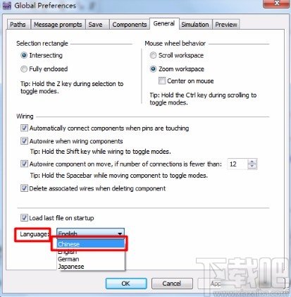 6.最后在General选项界面的左下角找到Language这个语言设置选项,打开下拉列表在其中就可以看到Chinese这个中文选项了,选择之后点击OK按钮保存语言设置,最后重启软件即可。