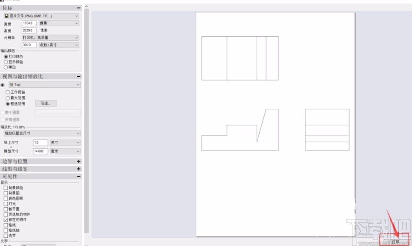 7.之后下一步我们点击软件界面左上角的打印图标,点击之后进入到打印三视图的界面,有时候三视图会超出打印纸张的范围,可以在左边的一些选项调整到刚好合适之后点击右下角的打印按钮。