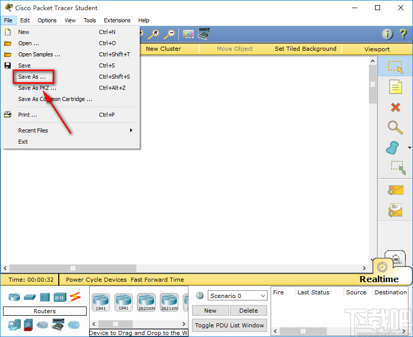 cisco packet tracer是一个功能强大的网络仿真程序,学生在该程序中可以尝试网络行为,不仅可以在程序中修改工作区的大小,还可以自动为接口名称创建标签以及将所有工作区导出为图片格式,功能非常具有特色。很多小伙伴在使用这款软件时,利用软件做了许多的操作后,发现不知道如何将文件进行保存。其实这款软件保存文件的方法很简单,只需要几个步骤就能完成。那么接下来小编就给大家详细介绍一下cisco packet tracer保存文件的具体操作方法,有需要的朋友可以看一看。