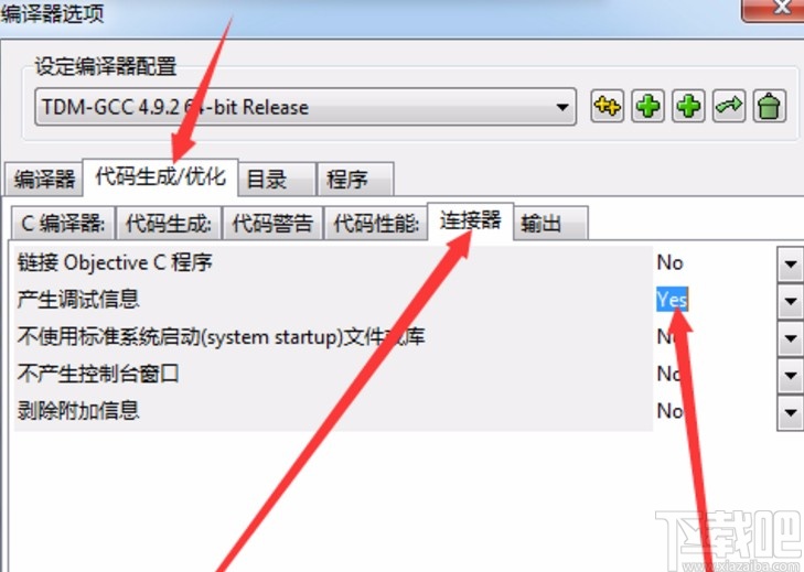 3.点击编译选项之后在出现的界面中选择切换到“代码生成/优化”,在它下面的界面中切换到连接器选项,然后将产生的调试信息选项后面的no切换为yes。