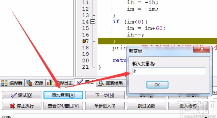 8.开始调试之后,我们在下方可以点击添加查看按钮来输入新的变量名来查看调试结果,想要结束调试的话点击停止执行按钮即可。