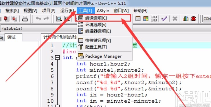 2.发生闪退情况的话,我们重新打开软件,编写好待调试代码,然后点击上方的工具选项,在出现的选项中点击“编译选项”。