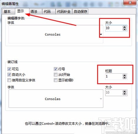 3.进入到编辑器选项设置界面之后,点击切换到显示界面,然后就可以看到编辑器字体设置模块了,在右边的大小位置可以直接输入想要调整的字体大小,下方还可以调整代码之间的栏距。