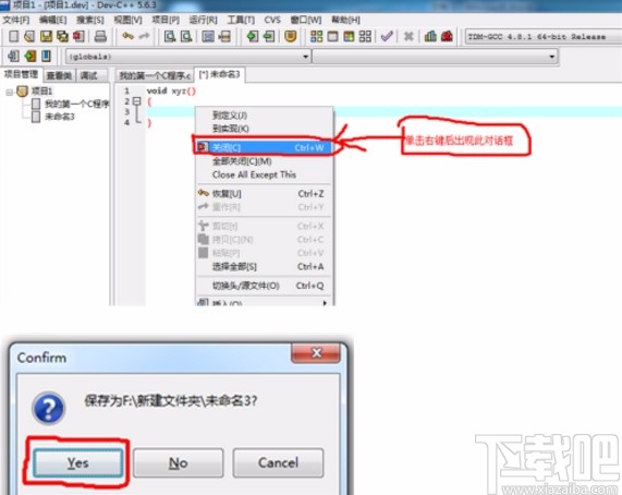 3.点击新建好头文件之后,我们在其中编写自己想要编写的代码,编写完成之后我们点击鼠标右键,在出现的选项中选择关闭,然后就会出现提示我们保存的窗口,接着点击Yes按钮。