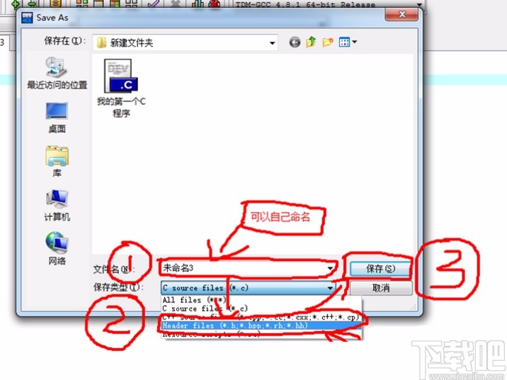 4.点击这个Yes按钮之后就会出现一个文件另存为的界面,设置好文件名称之后,点击下拉列表,然后在出现的选项中选择为Header files选项,再点击保存按钮,这样创建的头文件就保存好了。