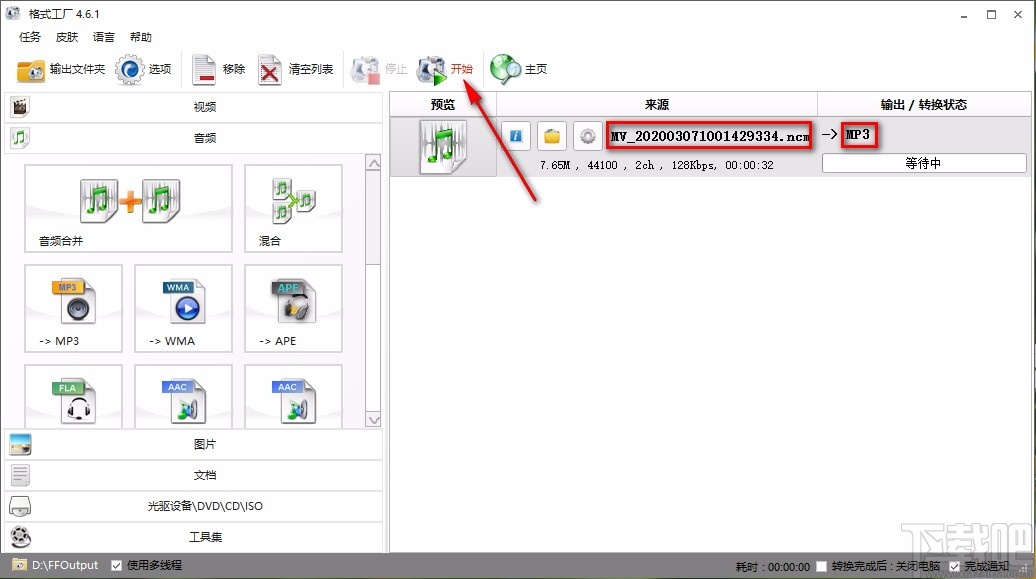 7.之后下一步我们就回到软件的主界面了,在主界面就可以看到这个ncm文件转MP3文件的任务,点击开始按钮即可开始转换操作,等待转换完成即可。