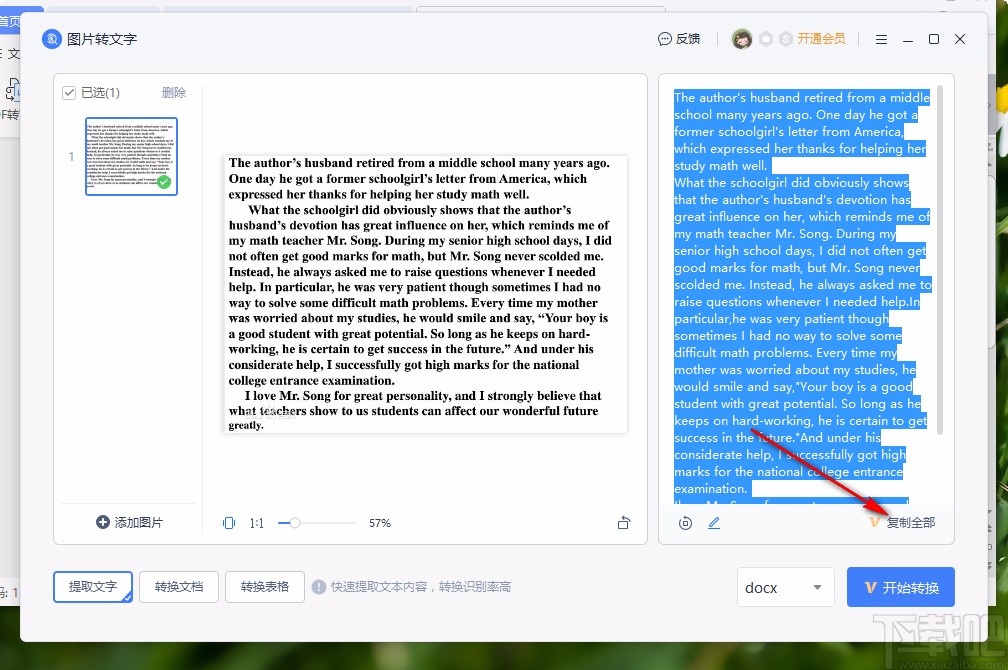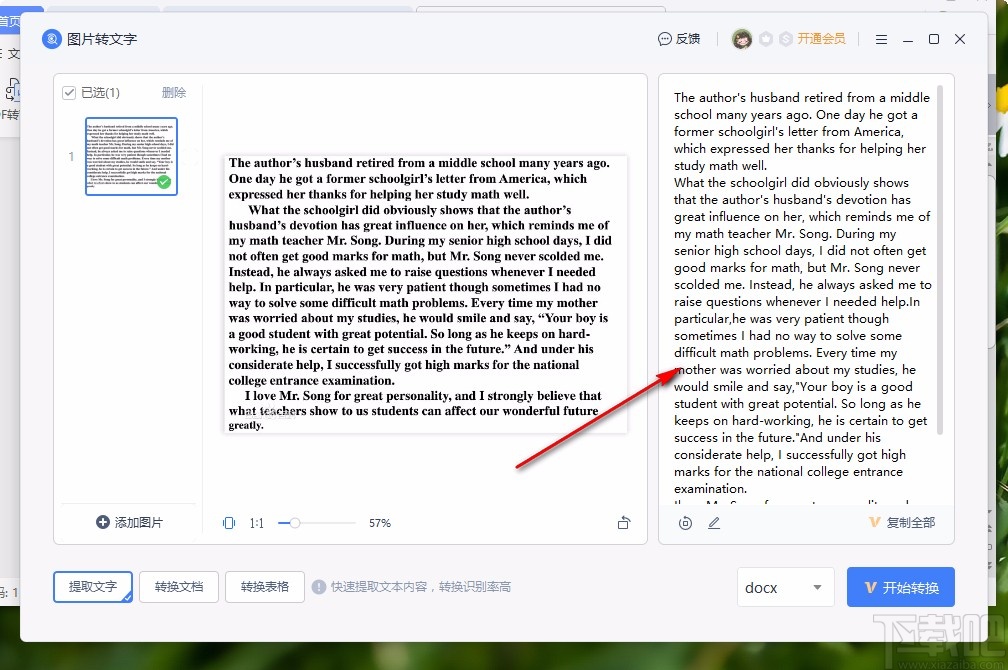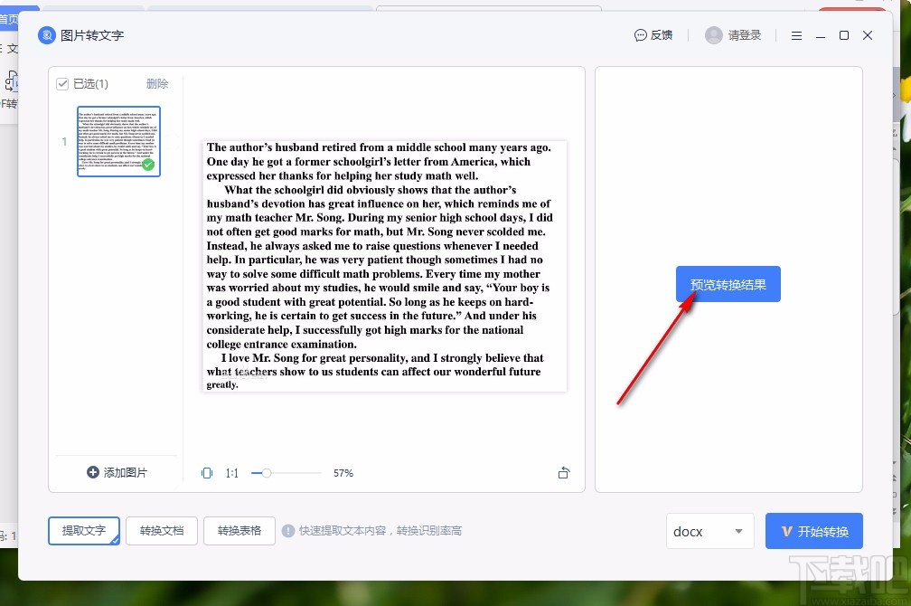 4.点击打开图片转文字功能界面之后,我们可以点击界面右边的预览转换结果按钮,查看图片文字识别之后的结果。