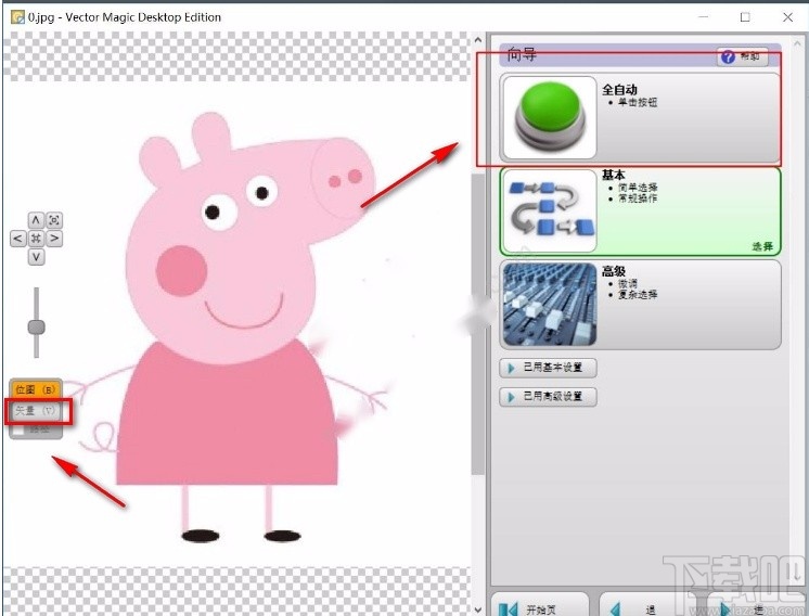 2.接着在界面左侧找到“矢量”选项,我们点击该选项后,再点击界面右上角的“全自动”按钮即可开始将图片转换为CAD文件的工作。
