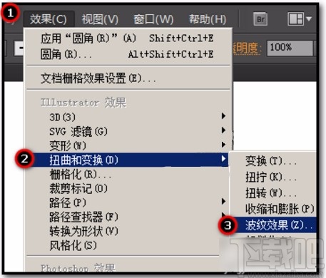 2.接着下一步,我们使用选择工具选中画出的直线之后,点击上方的效果选项,然后选择扭曲和变换选项后面的波纹效果这个选项。