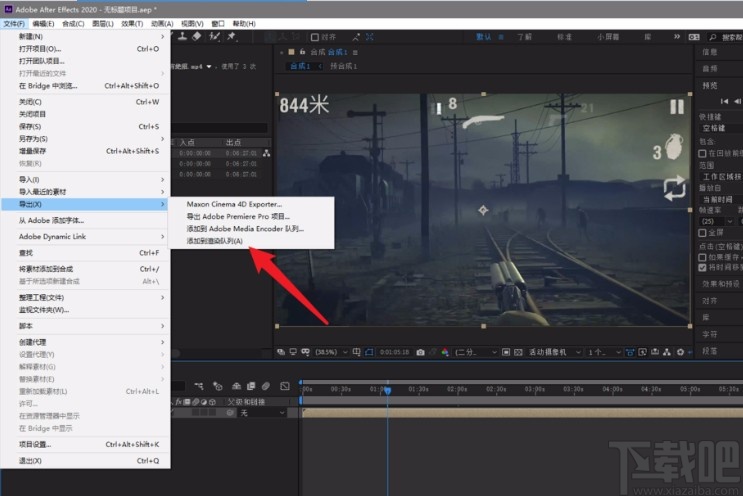 2.点击打开文件选项卡之后,我们在出现的列表中找到导出选项,然后选择添加到渲染队列这个选项并点击。
