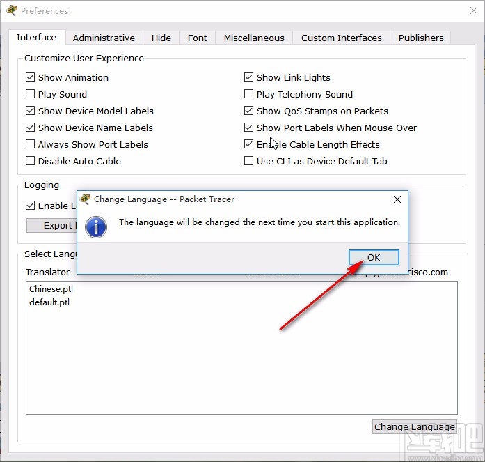 8.点击改变语言按钮之后,界面中会出现一个提示,表示语言的更改将会在我们再次打开软件的时候生效,点击OK按钮即可。