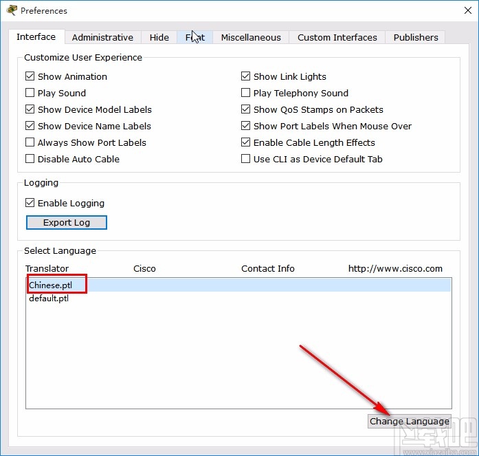 7.之后在Preferences界面,我们找到下方的Select Language这个设置语言模块,选中Chinese.ptl这个中文选项之后,点击右下角的Change Language这个改变语言按钮。