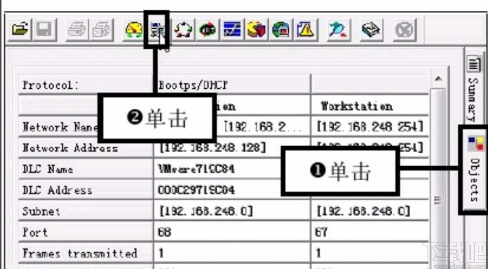 5.之后就会出现如下界面,我们在界面右边缘找到“Objects”并点击,就可以看到刚刚选中报文的详细信息;还可以点击界面上方的“Host Table”按钮查看报文统计。