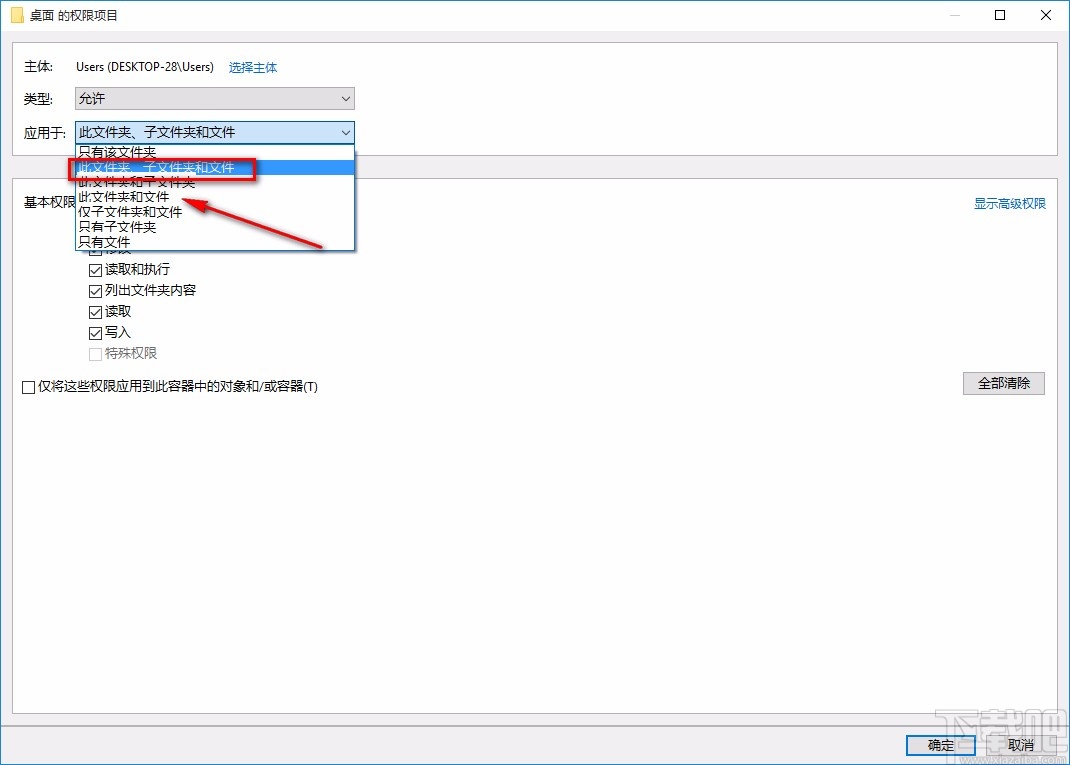 7.接着在页面左上方找到“应用于”选项,我们点击该选项后面的下拉框,并在下拉框中选择“此文件夹、子文件夹和文件”选项。