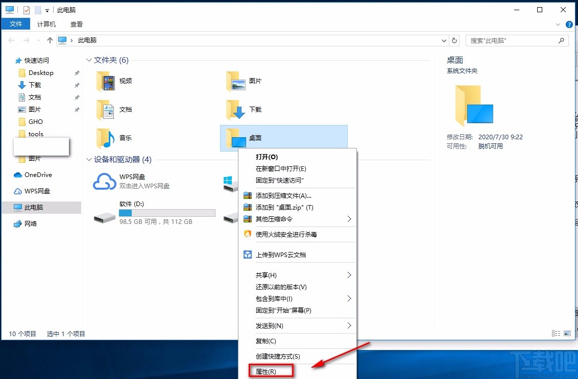 3.打开“此电脑”后,我们在文件夹找到不能保存文件的“桌面”并用鼠标右击,会出现一个下拉框,我们在下拉框中点击“属性”选项进入到桌面属性页面。