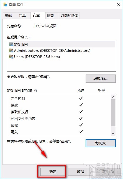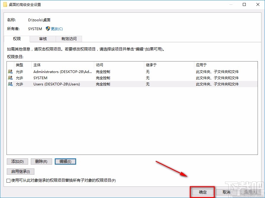 9.接下来在高级安全设置页面右下角找到“确定”按钮,我们点击该按钮就可以回到属性页面。