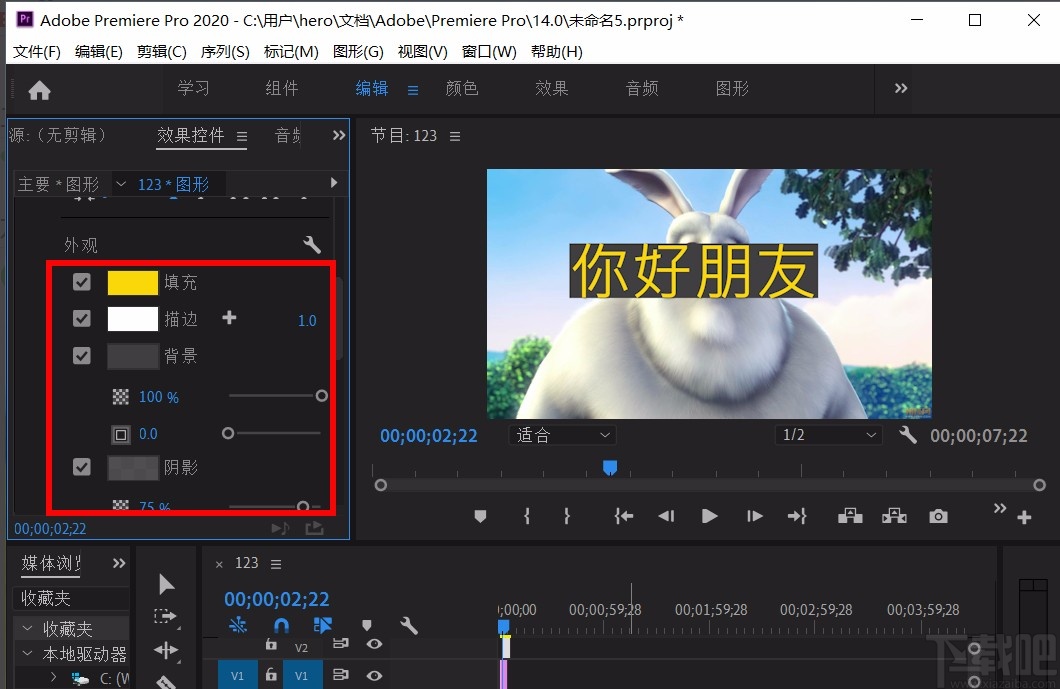 4.下拉左边的控件框,还可以找到填充、背景、描边等选项,我们可以使用这些控件对字幕的外观颜色、描边等进行设置。