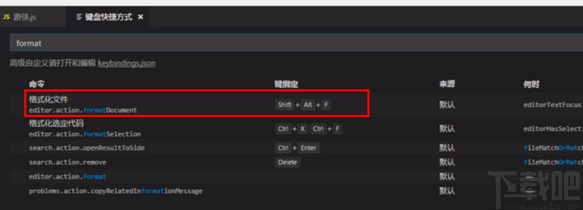 5.点击键盘快捷方式选项之后,接下来在出现的界面输入框中输入format格式进行搜索,然后就可以看到格式化文件的快捷键了。