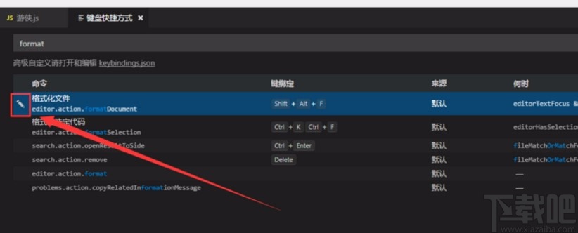 6.当我们想要更改格式化文件的快捷键时将鼠标移动到左边就可以看到悬浮的编辑图标了,如下图中所示,然后我们点击它。