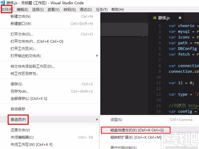 4.还有一种就是按键盘快捷键的方式进行代码格式化,可以先设置自己习惯使用的快捷键,点击上方文件选项卡之后,在出现的菜单选项中点击首选项,然后再点击键盘快捷方式。