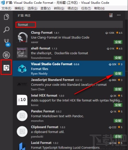 2.另外我们也可以在界面左边点击扩展图标,然后在扩展中心中输入format关键词,在搜索自动格式化代码的插件安装使用,如下图中所示。