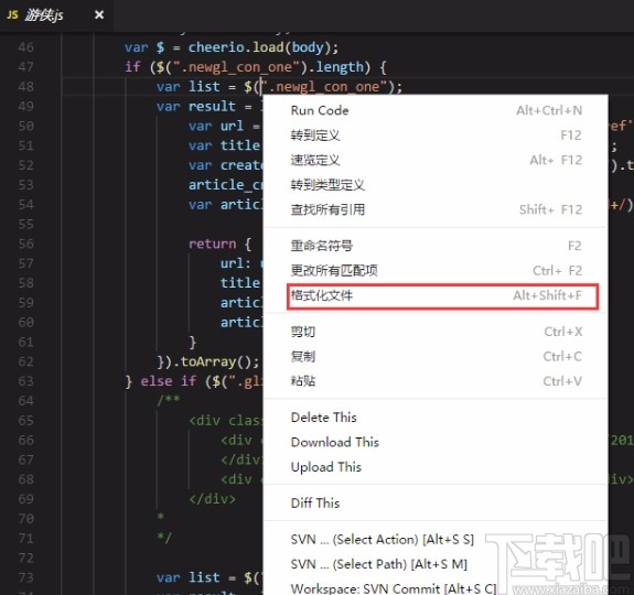 1.首先第一种方法就是我们在编写代码的界面中,点击鼠标右键之后,在出现的菜单中点击选择格式化文件选项并点击。