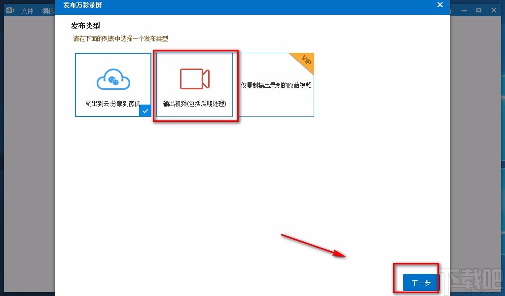 2.在发布类型页面中,我们找到位于页面上方的“输出视频”选项,选中该选项后,再点击页面右下角的“下一步”按钮。