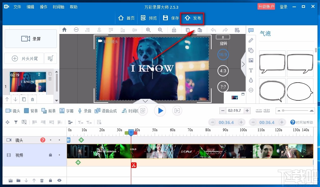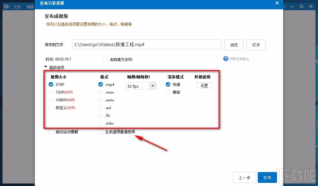 6.对参数设置完毕后,我们在页面右下角找到“发布”按钮,点击该按钮就可以将视频导出软件了。